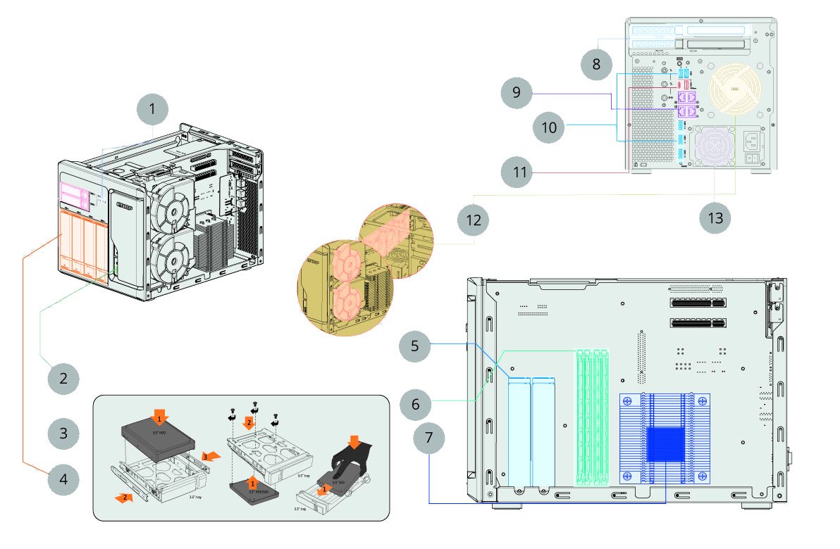 5. Специальная конструкция лотков для жестких дисков позволяет устанавливать и снимать 3,5” HDD и 2,5”HDD/SSD в соответствующих слотах без инструментов;